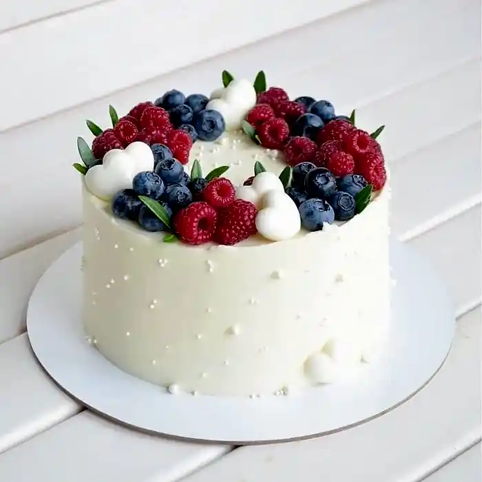 Pin-Up для девушек, покрытый крем-чиз. Украшен ягодами и шоколадными сердечками