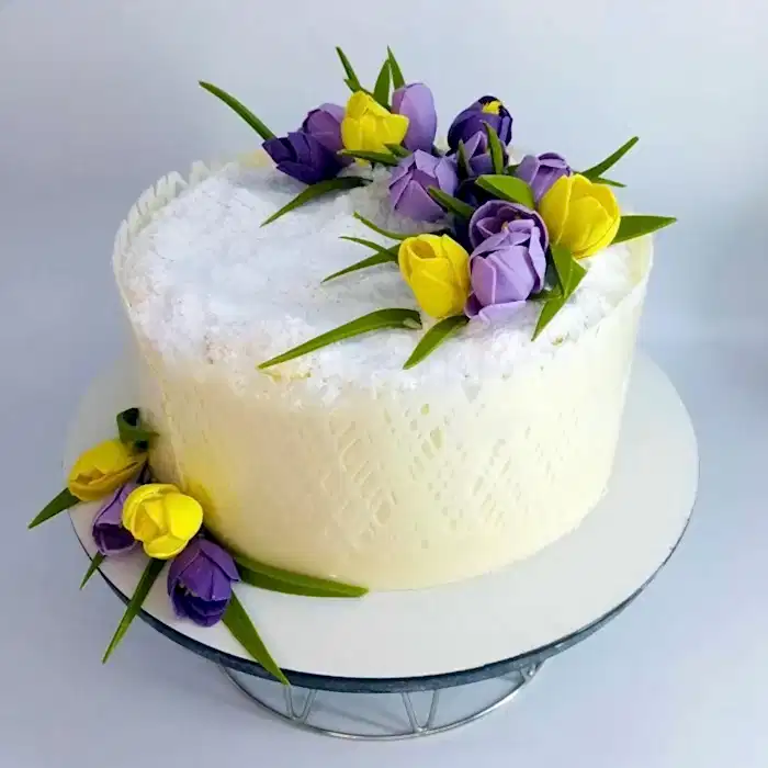 Торт для девушек, покрытый крем-чиз. Pin-Up сахарными цветами и шоколадной сеточкой